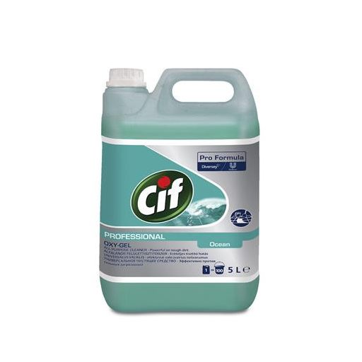 A Cif Professional Oxy-Gel Ocean aktív oxigént tartalmazó általános tisztítószer kitűnően alkalmas padlók és egyéb mosható felületek tisztítására. Alkalmazása során az aktív oxigén mikro-buborékokat hoz létre, melyek segítik a szennyeződések felszedését a felületekről, amit aztán a gél könnyedén és gyorsan eltávolít. Az eredmény kiváló és érezhető tisztaság és kellemesen frissítő óceán illat.