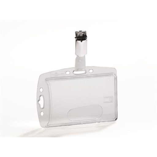 Víztiszta azonosító-, és biztonságikártya-tartó forgatható csíptetővel.