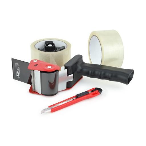 -az adagolóhoz 2 tekercs átlátszó csomagolószalag (50 mm x 50 m), és egy 9 mm-es, lepattintható univerzális kés is tartozik