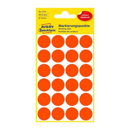Etikett, 18 mm, kör, AVERY ZWECKFORM, neon piros, 96 etikett/csomag