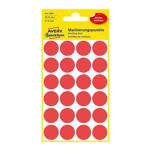 Etikett, 18 mm, kör, eltávolítható, AVERY ZWECKFORM, piros, 96 etikett/csomag