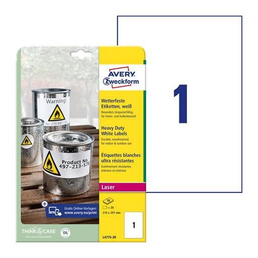Etikett, 210x297 mm, poliészter, időjárásálló, 210x297 mm, AVERY ZWECKFORM, fehér, 20 etikett/csomag