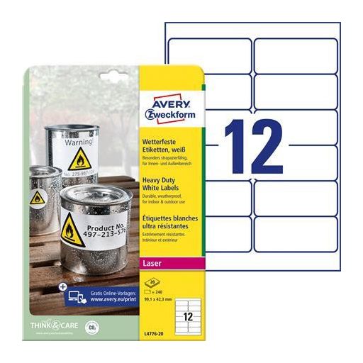 Etikett, 99,1x42,3 mm, poliészter, időjárásálló, AVERY ZWECKFORM, fehér, 240 etikett/csomag