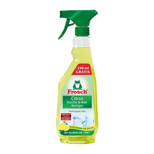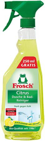 A Frosch zuhany és fürdőszobai tisztítószer a citromsav erejével hatékonyan távolítja el a vízkövet. Alkalmazható szappan maradványok, vízfoltok és egyéb szennyeződések esetén.
