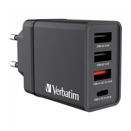 Hálózati töltő, 1xUSB-C PD (20W), USB-A QC 3.0, 2xUSB-A (10W), VERBATIM, fekete