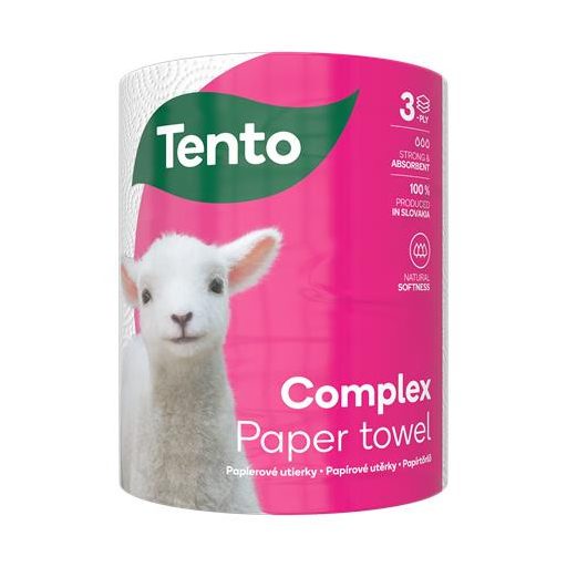 Az új Tento Complex papírtörlő egy innovatív termék melyben 1 rétegű ipari törlőkendő és 2 rétegű papírtörlő sikeresen ötvöződik. Az erős, kék réteg kiválóan eltávolít bármilyen szennyeződést. A két fehér papírréteg szivacshoz hasonló nedvszívó réteg, mely felszárítja és fényesíti a felületet.