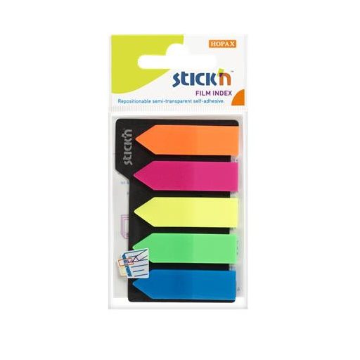 Jelölőcímke, műanyag, nyíl, 5x25 lap, 42x12mm, STICK N, neon színek