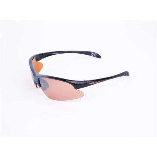 Sportnapszemüveg borostyánszínű HD lencsével, fekete-szürke műanyag kerettel.