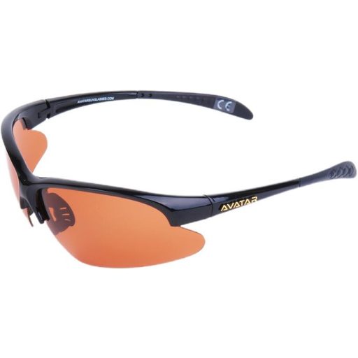Sportnapszemüveg borostyánszínű HD és polarizált lencsével, fekete műanyag kerettel.