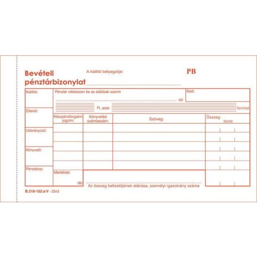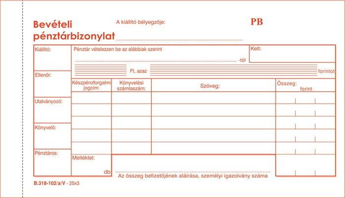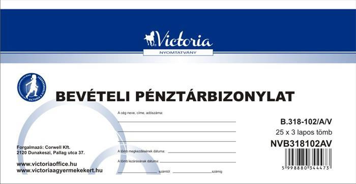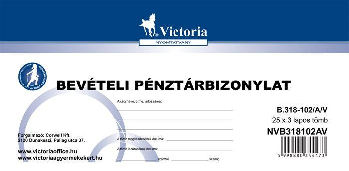 Nyomtatvány, bevételi pénztárbizonylat, 25x3, VICTORIA PAPER "B.318-102", 10 tömb/csomag