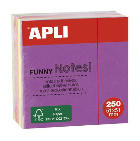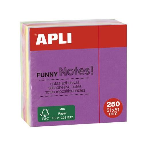 Öntapadó jegyzettömb, 51x51 mm, 250 lap, APLI "Funny", neon