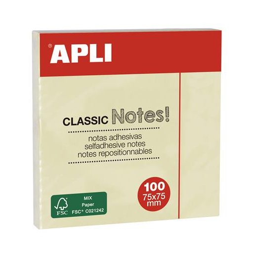 Öntapadó jegyzettömb, 75x75 mm, 100 lap, APLI "Classic", sárga