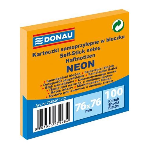 Öntapadó jegyzettömb, 76x76 mm, 100 lap, DONAU, neon narancssárga