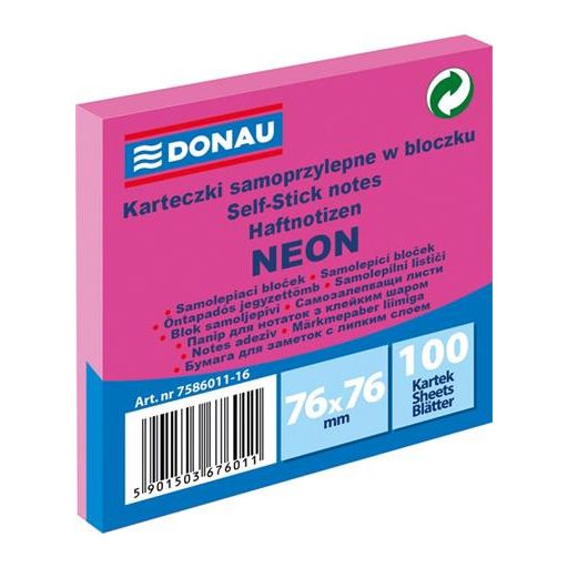 Öntapadó jegyzettömb, 76x76 mm, 100 lap, DONAU, neon rózsaszín