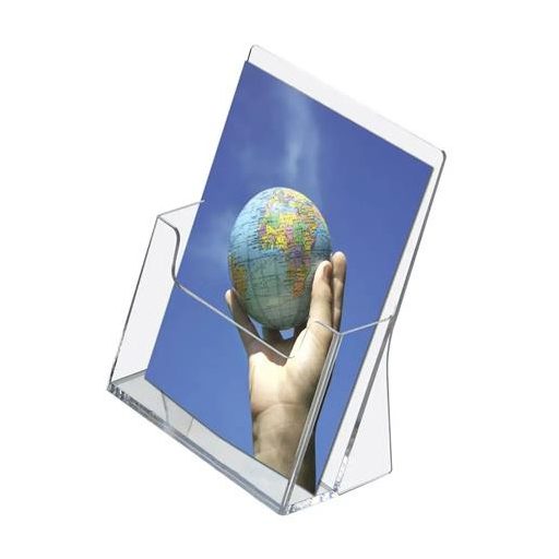 Az A5 méretű asztali szórólaptartó praktikus és esztétikus megoldás prospektusok, katalógusok és egyéb információs anyagok kihelyezésére.