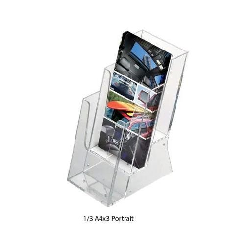 Az 1/3 A4 méretű, asztalra és falra is helyezhető prospektustartó univerzális és praktikus megoldás többféle szóróanyag egyidejű kihelyezésére.