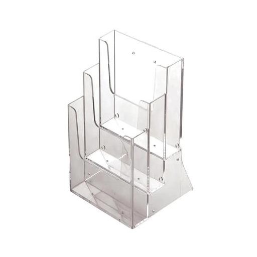 A 3 rekeszes, asztalra és falra is helyezhető A4-es szórólaptartó praktikus és esztétikus megoldás többféle kiadvány egyidejű megjelenítésére.