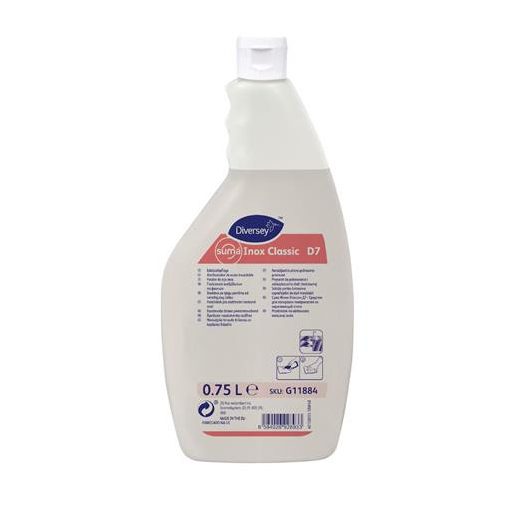 A Suma Inox Classic D7 speciális összetételének köszönhetően ragyogó tisztaságot teremt a rozsdamentes acél felületeken. Hatékonyan használható élelmiszerrel közvetlenül nem érintkező felületeken, pl. hűtők-, asztalok-, pultok-, fagyasztók ajtóinak-, szervizkocsik- és mosogatógépek vagy egyéb berendezések külső felületeinek védelmére, ápolására. Egyedi, paraffinolajat és felületaktív hatóanyagokat tartalmazó formulája könnyedén eltávolítja a vízcseppek és ujjnyomok által okozott szennyeződéseket és hosszan tartó ragyogást biztosít a felületeken. A megtisztított felületen védőréteget képez, amely gátolja a zsír, por és egyéb szennyeződések lerakódását, egyúttal vízlepergető hatású.