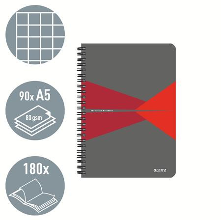 Spirálfüzet, A5, kockás, 90 lap, laminált karton borító, LEITZ "Office", szürke-piros