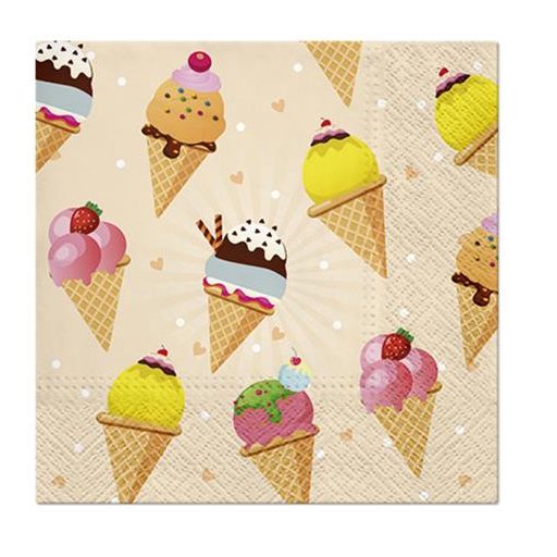 Kerti partikhoz, sütögetős bulikhoz, születésnapokhoz ajánljuk ezt a színes fagyi mintás szalvétát, amelyet kiegészíthetsz hozzá illő tányér és pohár együttesével.