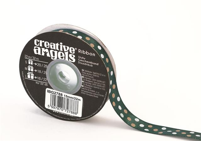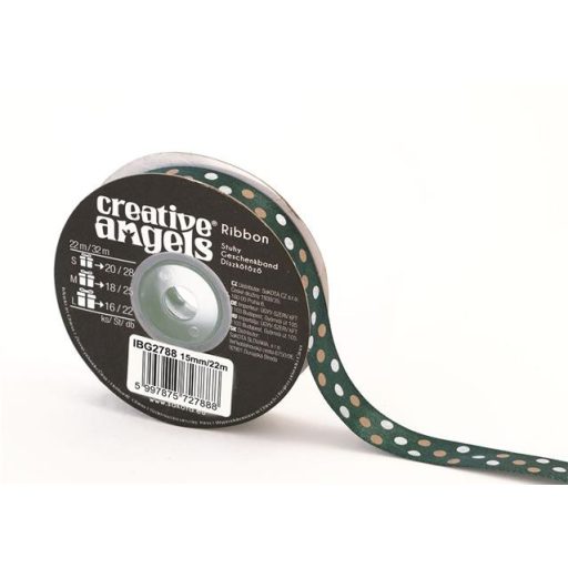Szatén szalag, 15 mm x 22 m, sötétzöld vegyes pötyökkel