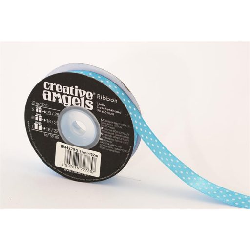 Szatén szalag, 15 mm x 22 m, világos kék fehér pötyökkel