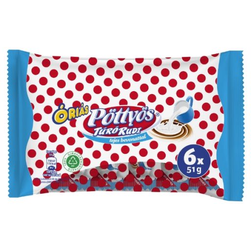 A Tejdesszert Pöttyös Óriás Rudi 6×51 g tejbevonóval a jól ismert túródesszert nagyobb, laktatóbb változata, praktikus multipack kiszerelésben. Minden egyes rudi lágy, krémes túrótölteléket rejt, amelyet finom, édeskés tejbevonó vesz körül, így harmonikus ízélményt nyújt minden falat.