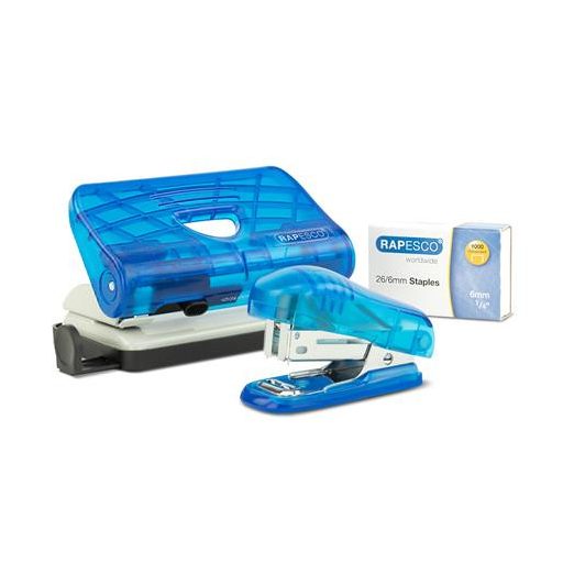 Tűzőgép és lyukasztó szett 24/6, 26/6, 12 lap, RAPESCO, átlátszó kék, tűzőkapoccsal