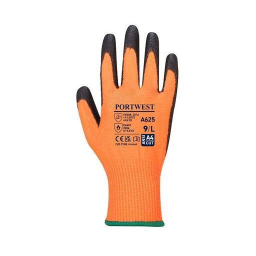 D szintű vágásbiztosságot garantáló munkavédelmi kesztyű PU (poliuretán) bevonattal, jól láthatósági kézháttal, vágásbiztosságra és hőállóságra tesztelve.