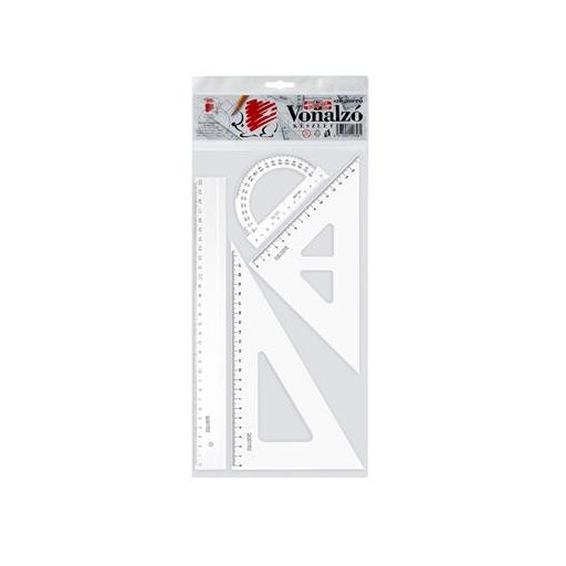 tartalma: 30 cm egyenes-, 45°-os és 60°-os háromszög vonalzó, 180°-os szögmérő.