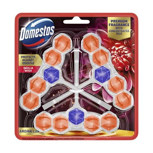 A Domestos Aroma Lux WC-frissítő blokkokat a parfümös illóolajok teszik különlegessé. Segítségükkel kellemes, intenzív illatot varázsolhat WC-jében az egyes öblítések között is.