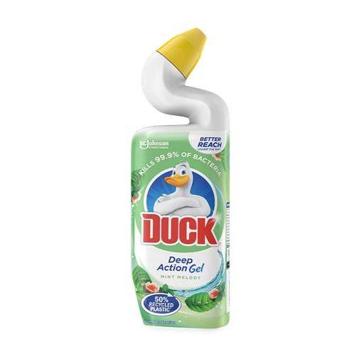 A menta illatú Duck Deep Action fertőtlenítő WC-tisztító gél megöli a baktériumok 99,9 %-át. Különleges, ívelt nyaknak köszönhetően a perem alatti rész is könnyedén elérhető, tisztaságot és friss illatot biztosít a toalettben.