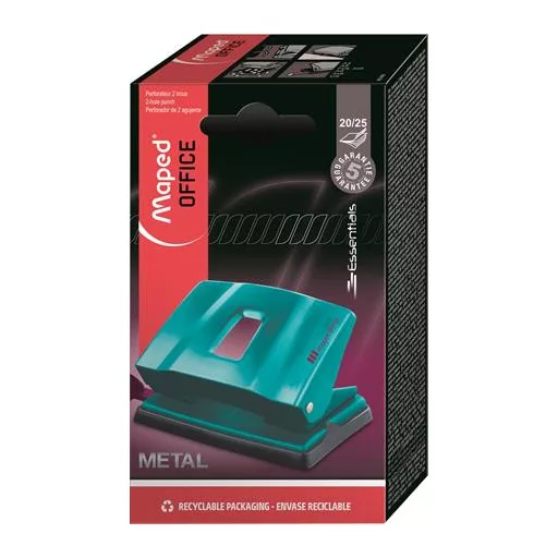 Lyukasztó, kétlyukú, 25 lap, fém, MAPED "Essentials 25", türkiz