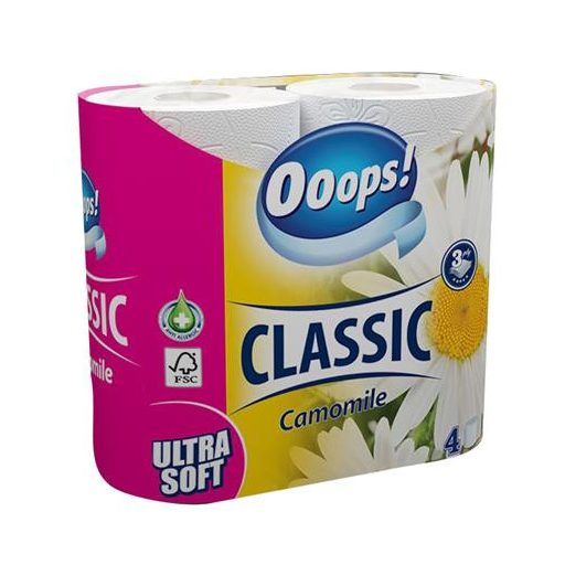 Toalettpapír, 3 rétegű, kistekercses, 4 tekercs, OOOPS "Classic", kamilla