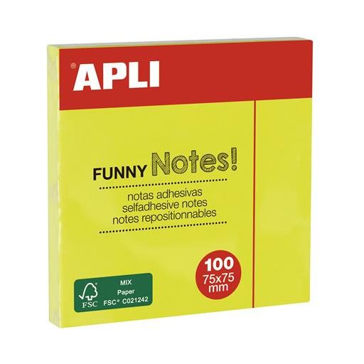 Öntapadó jegyzettömb, 75x75 mm, 100 lap, APLI "Funny", neon sárga