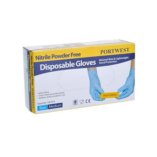 Védőkesztyű, egyszer használatos, nitril, M méret, púder nélküli, kék